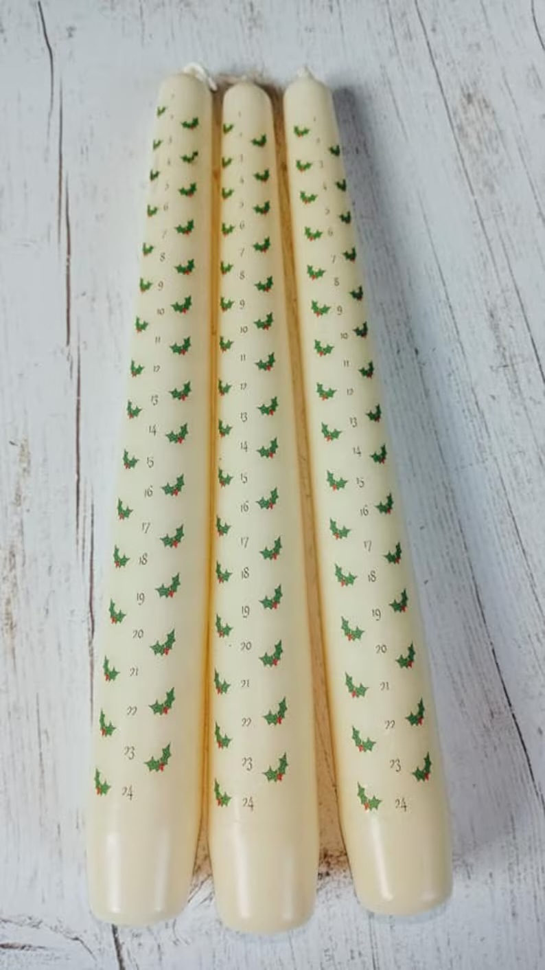 Count down the days to Christmas in a beautifully traditional way. Each candle features numbers from 1–24, paired with charming holly motifs, allowing you to burn a little each day as you make your way toward the big celebration.