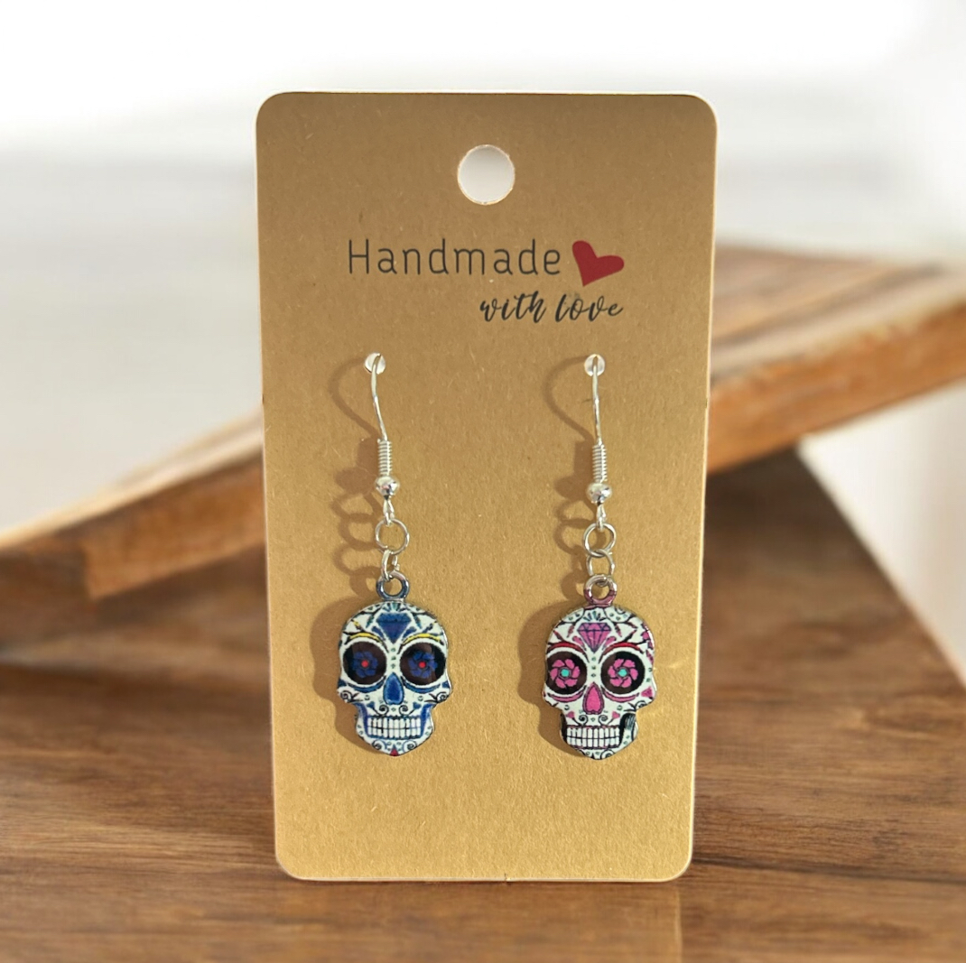 Add a bold touch of colour and personality to your look with these Handmade Sugar Skull Earrings. Inspired by the vibrant Day of the Dead (Día de los Muertos) tradition, these unique dangle earrings are perfect for anyone who loves statement jewellery / jewelry with a gothic, boho, or festival vibe. Featuring lightweight skull charms decorated with intricate floral patterns in striking colours, making them a standout accessory for everyday wear, Halloween parties, concerts, or gifting to someone who loves quirky, alternative style.