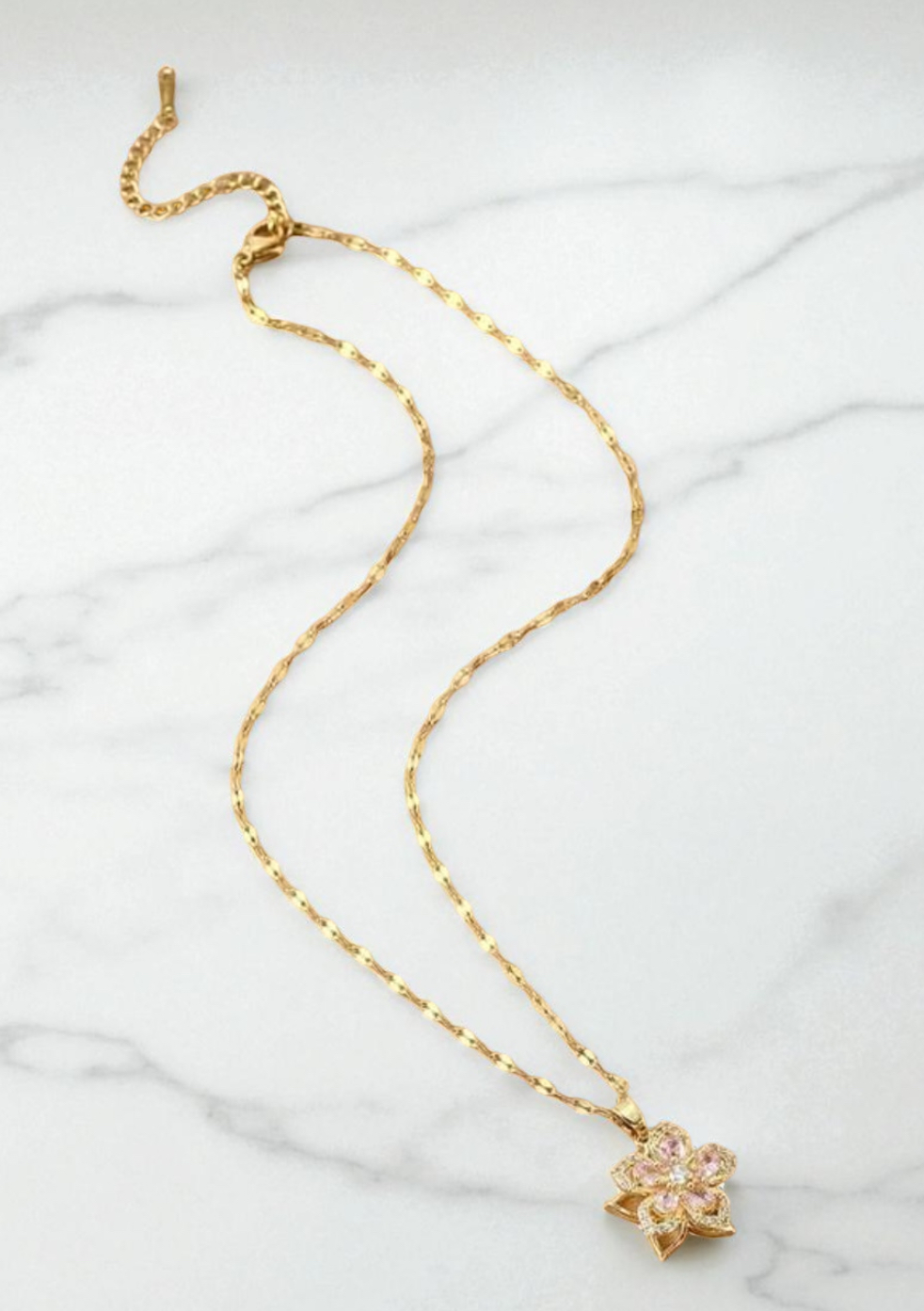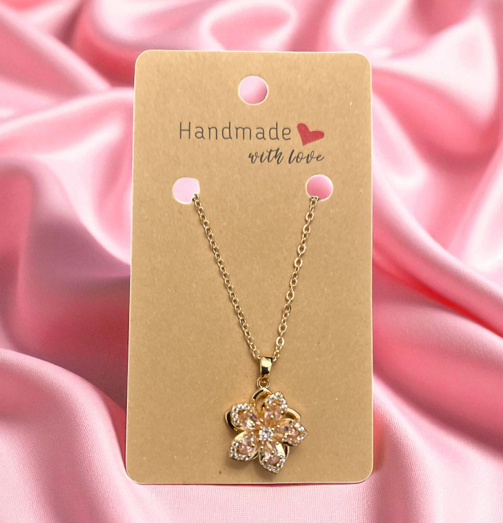 Elevate your jewellery collection with this exquisite handmade flower pendant necklace. The stunning design features a delicate floral motif adorned with sparkling pink crystals, set in a luxurious gold-toned finish. The pendant showcases intricate craftsmanship with its detailed petals and crystal embellishments that catch and reflect light beautifully.