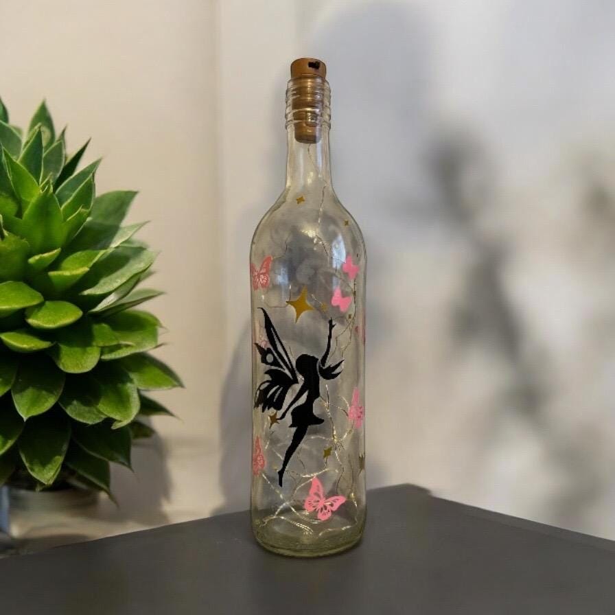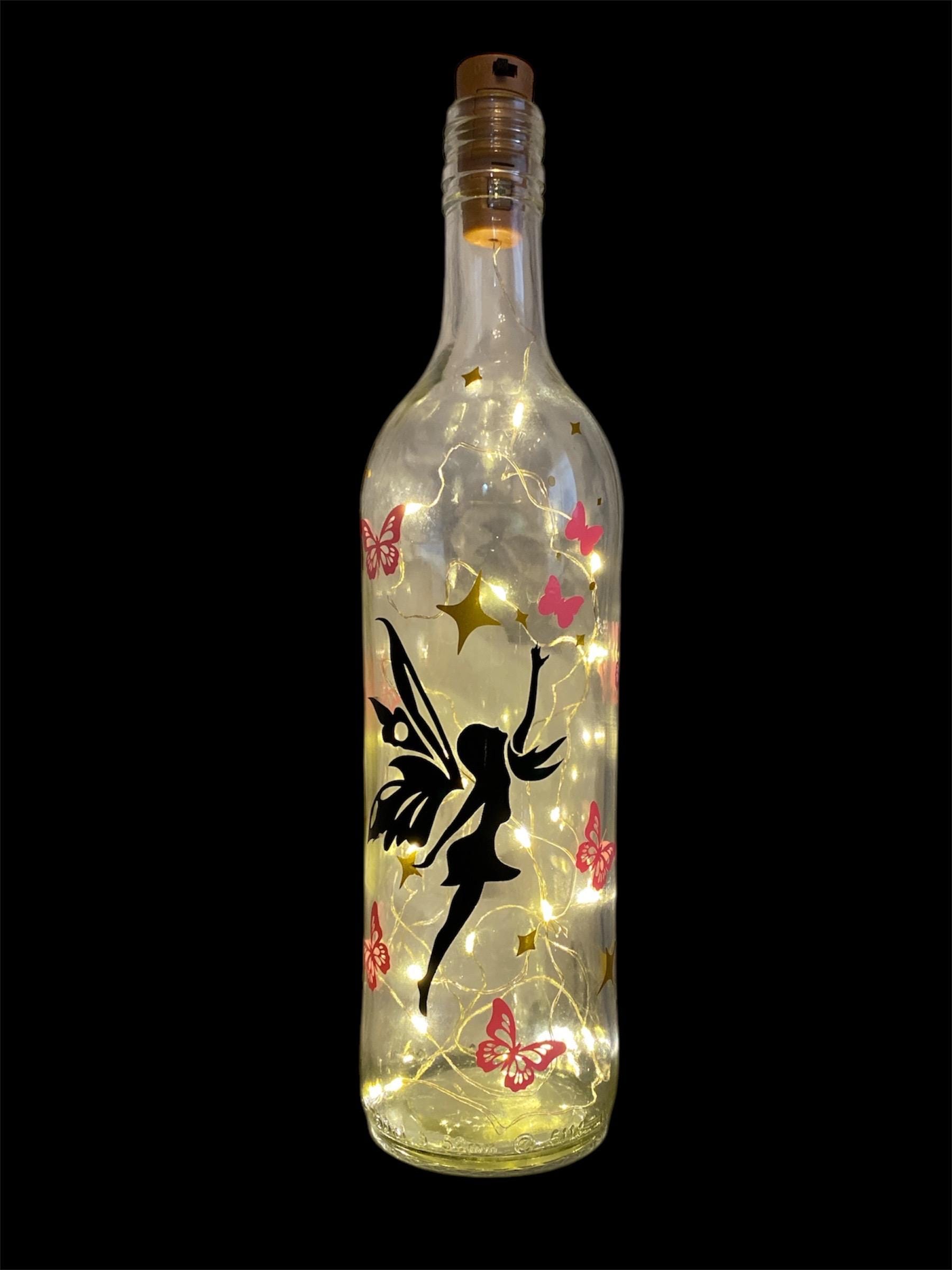 Create a cozy and enchanting atmosphere with this beautifully handcrafted fairy light bottle. Featuring a delicate fairy silhouette, fluttering butterflies, and warm LED lights, this unique lamp makes the perfect addition to any living space. Whether you're looking for a thoughtful gift or a charming decorative piece, this glowing glass bottle is sure to bring a touch of magic to any room. Crafted from an Upcycled wine bottle with warm white LED lights inside.