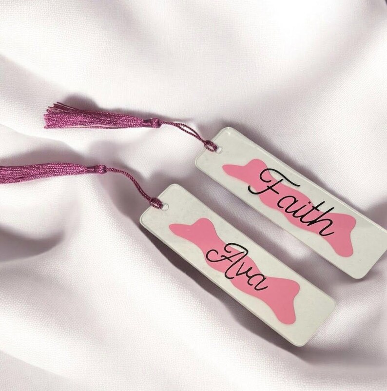 Each bookmark features a smooth, glossy acrylic base and a vibrant vinyl design, customised with the name of your choice to create a truly unique keepsake. Finished with a soft, elegant tassel, these bookmarks don’t just hold your place — they add a little charm to every page you turn.