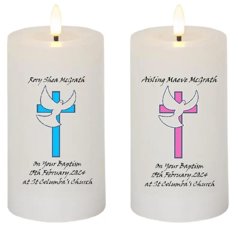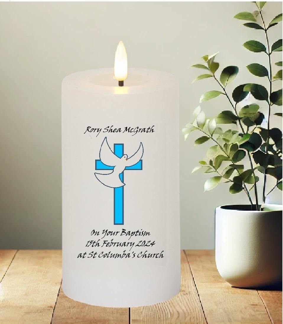 Celebrate your child's special day with our personalised christening candle, beautifully adorned with an elegant cross design.