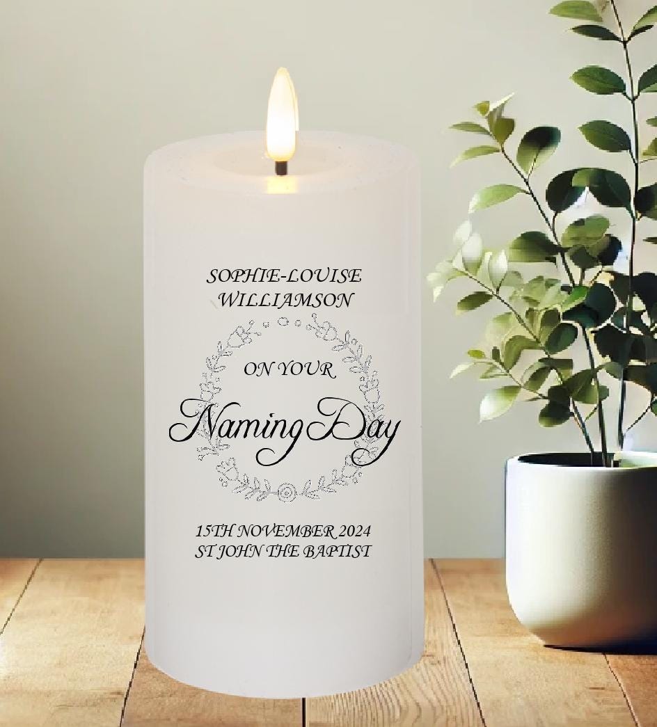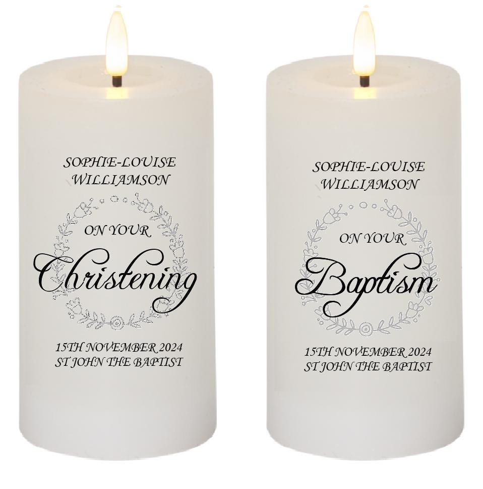 Celebrate your child's special day with our personalised christening candle, beautifully adorned with an elegant wreath design.