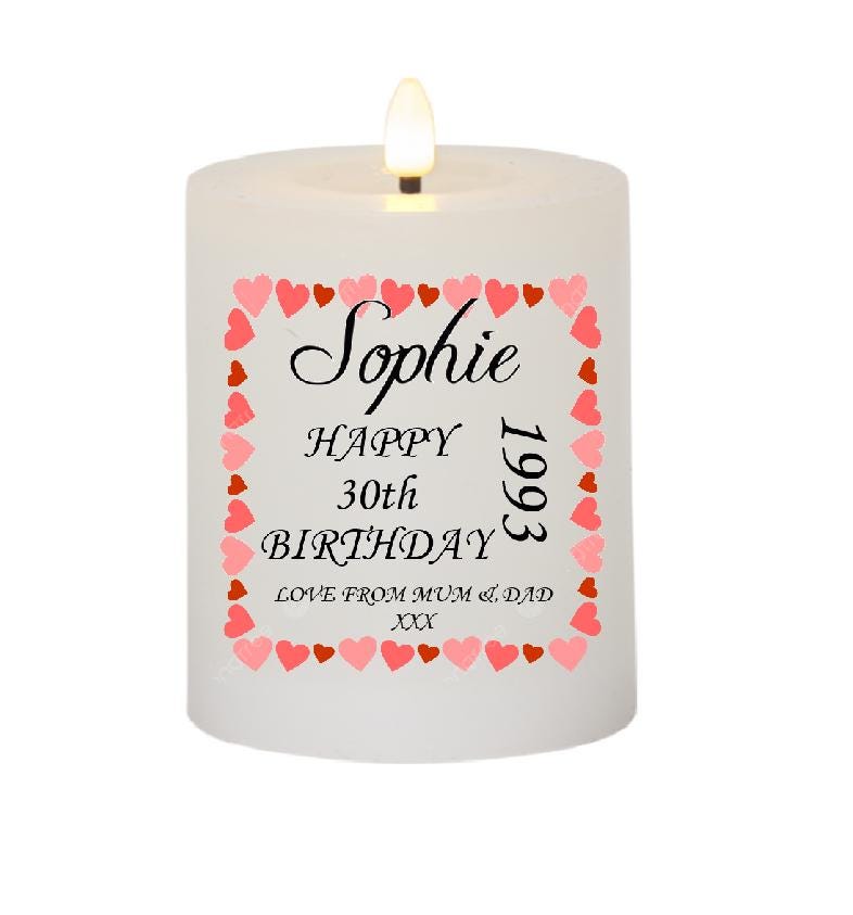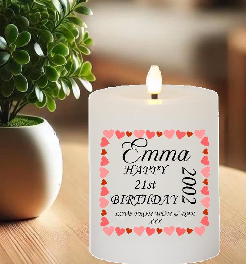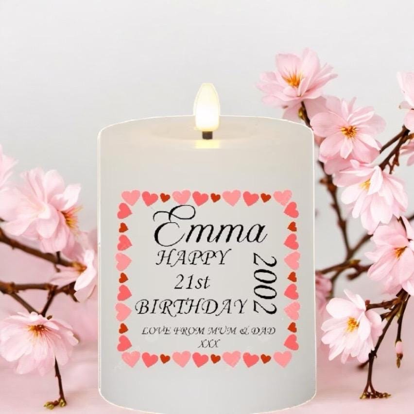 Make their birthday truly unforgettable with this personalised pillar candle, featuring a beautiful heart border, custom name, age, year of birth and heartfelt message.