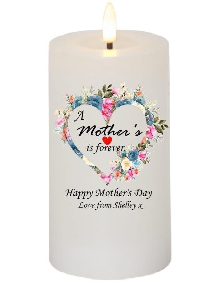 Celebrate Mother s Day with this beautiful personalised pillar candle, featuring a floral heart design and the phrase A Mother s Love is Forever,