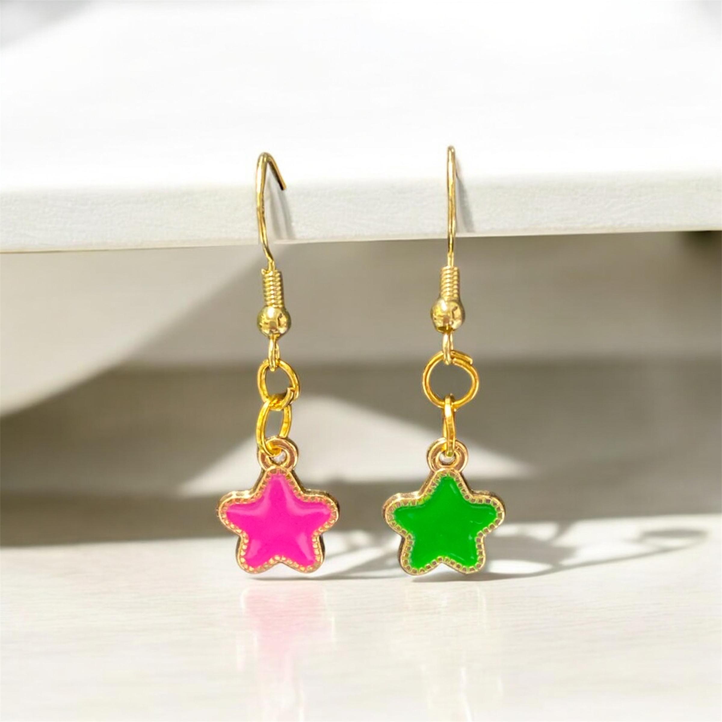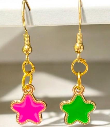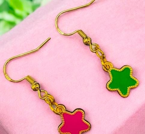 Add a touch of elegance to your jewellery collection with these stunning handmade dangle earrings. Festuring vibrant green and pink stars, these earrings are lightweight, versatile, and perfect for any occasion. Whether you’re dressing up for a formal event or adding a subtle statement to your everyday look, these earrings are a timeless choice.