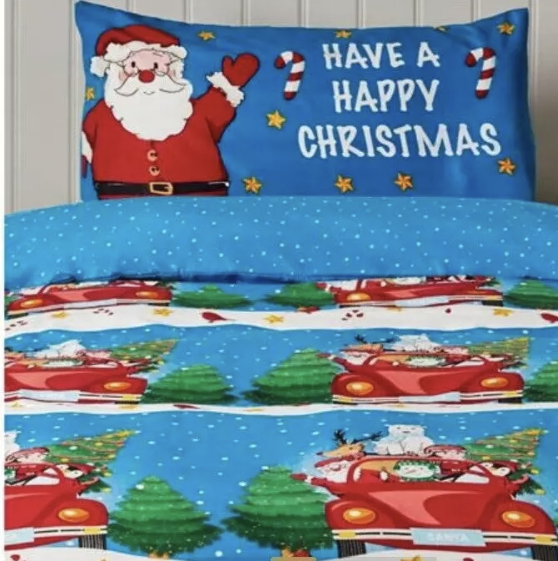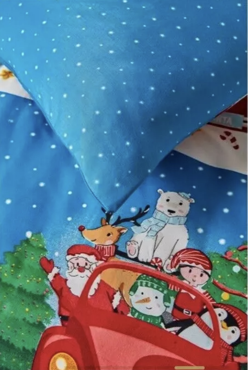 Bring festive cheer to bedtime with this fun and colorful Santa and Friends single duvet cover set. Featuring Santa, his reindeer, and a friendly polar bear riding in a bright red car with a Christmas tree, this bedding is perfect for creating a cozy holiday atmosphere in any bedroom. The vibrant blue background with snowy details, Christmas trees, candy canes, and festive stars adds an extra touch of seasonal magic.