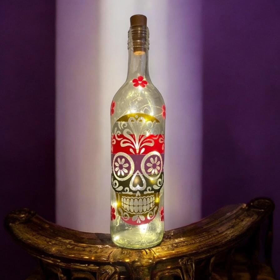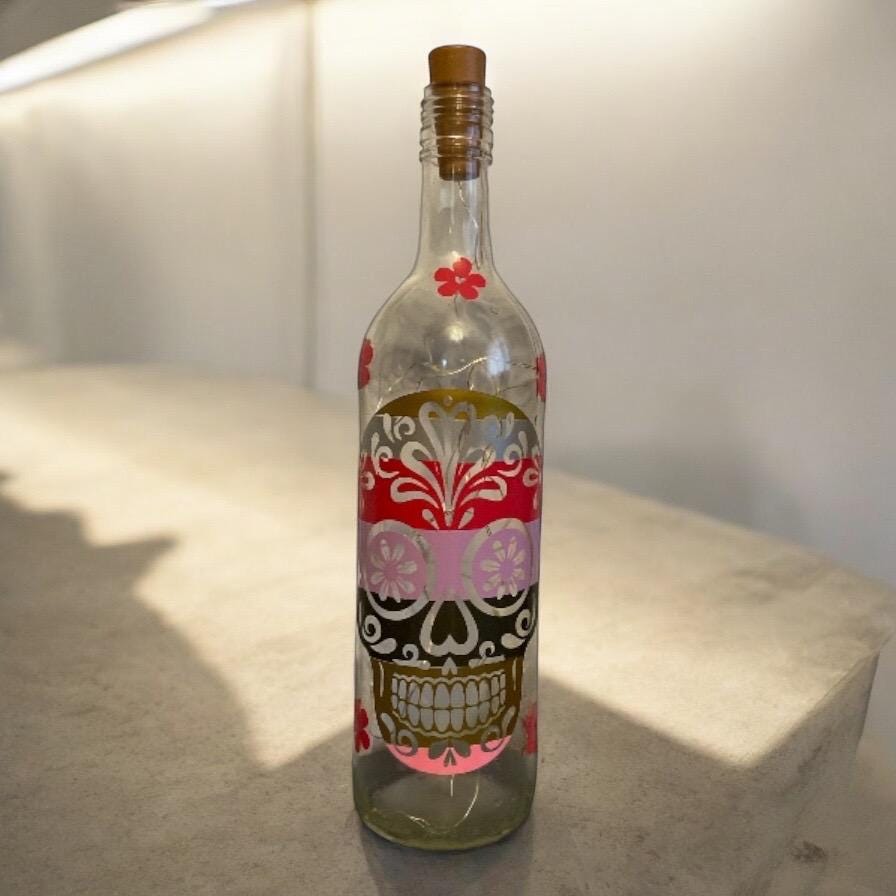 Add a touch of charm and mystery to your space with this one of a kind wine bottle light featuring a stunning multi coloured vinyl sugar skull design. Perfect as gothic home decor, a unique gift, or a statement nightlight. Crafted from an Upcycled wine bottle with warm white LED lights inside.