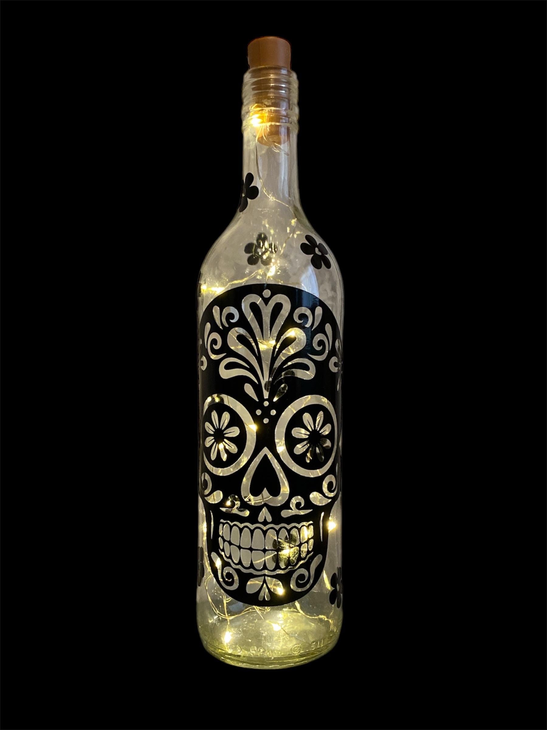 Add a touch of charm and mystery to your space with this handmade wine bottle light featuring a stunning black vinyl sugar skull design. Perfect as gothic home decor, a unique gift, or a statement nightlight. Crafted from an Upcycled wine bottle with warm white LED lights inside.